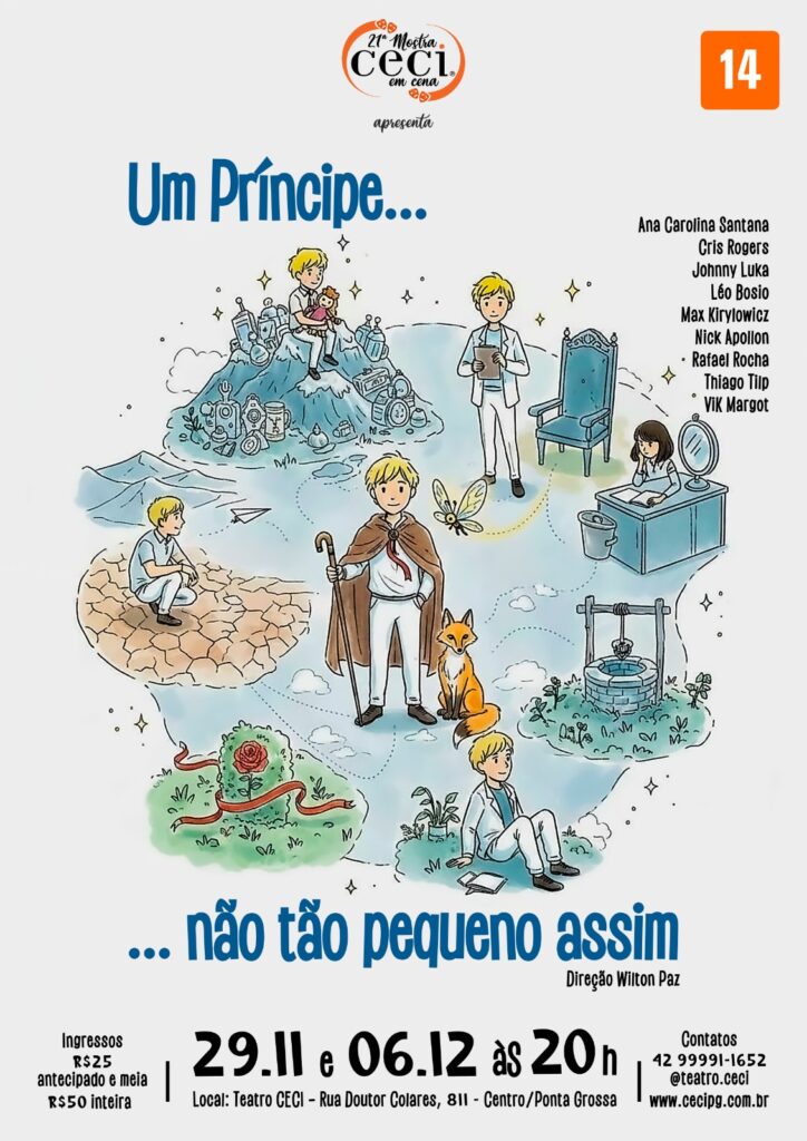 Sinopse: Na penumbra de uma floresta de memórias, a escritora Chiara luta contra o esquecimento. Ela está escrevendo a jornada do Príncipe Willian, uma versão “não tão pequena” do herói clássico, que já parte em sua viagem carregando um espelho trincado. A jornada de Willian não é pelo espaço, mas por reinos que habitam em todos nós: ele enfrenta os sete extremos que dividem a alma humana. Guiado por sua fiel companheira Raposa, Willian busca conhecer a sí próprio, enfrentando os mais profundos medos e desafios de quem um dia irá crescer. “Um príncipe não tão pequeno assim” é poético, é reflexivo, é memória, afeto e a luta pela busca de enfrentar a vida adulta.